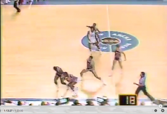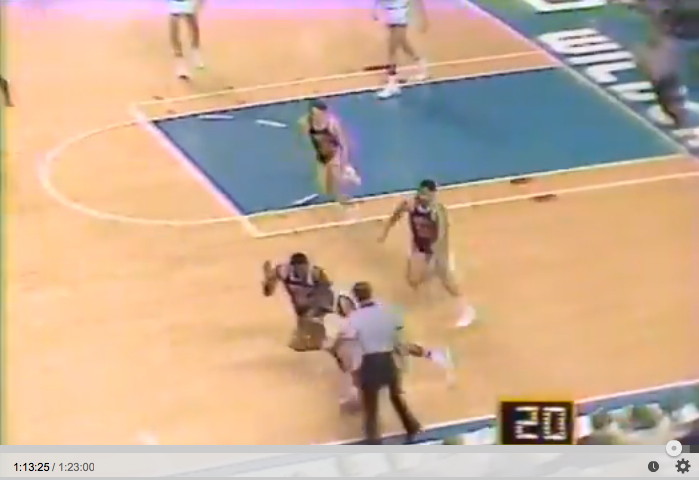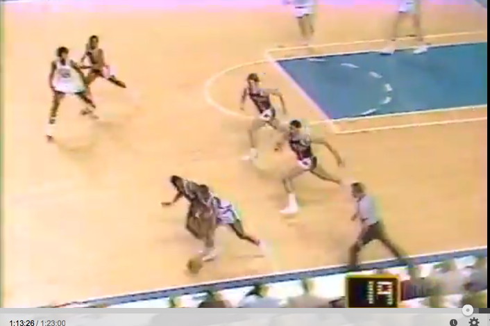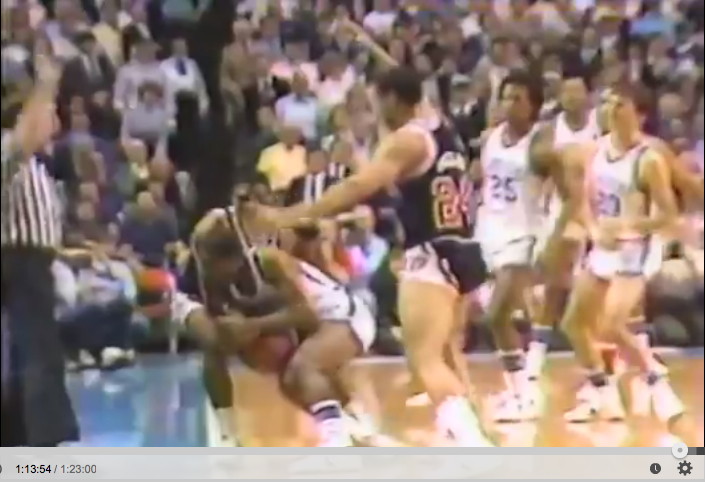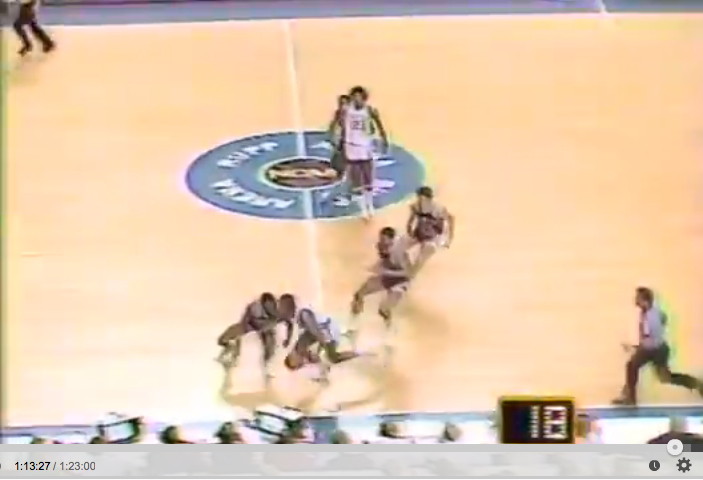 Beal did such a good job of retaining his pivot foot that he did so while being fouled and pulled down by Illinois' Bruce Douglas (Douglas BTW never had a clear hold of the ball for a tie-up and in fact Douglas' foot was out of bounds at the time.)