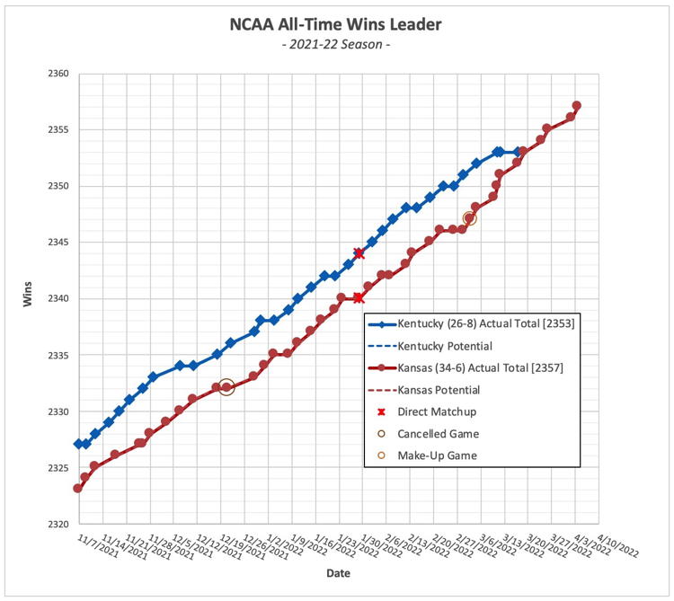 Kentucky once again begins to falter but regains its form just in time to be the first to 2000-victories, while North Carolina tries to fend off Kansas. Duke keeps pace as it lurks in fourth place.