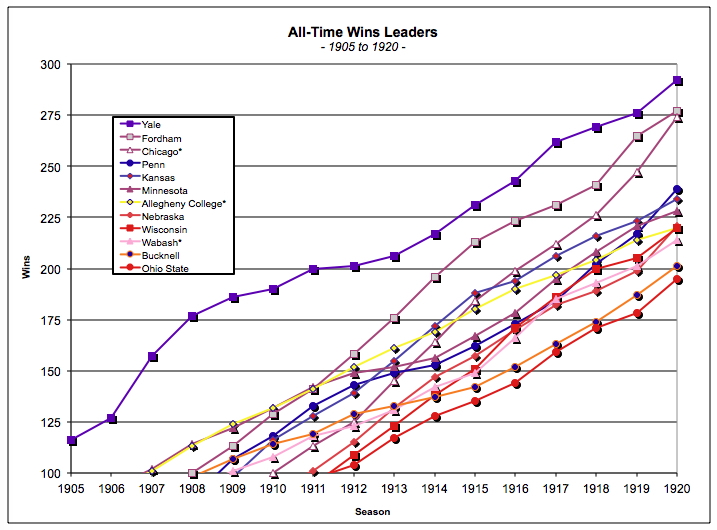 Note: Allegheny College, University of Chicago, Williams College and Wabash College are included in this chart as early leaders in all-time wins, although they currently do not compete in the NCAA Division I and thus are not considered in the official NCAA Division I records.