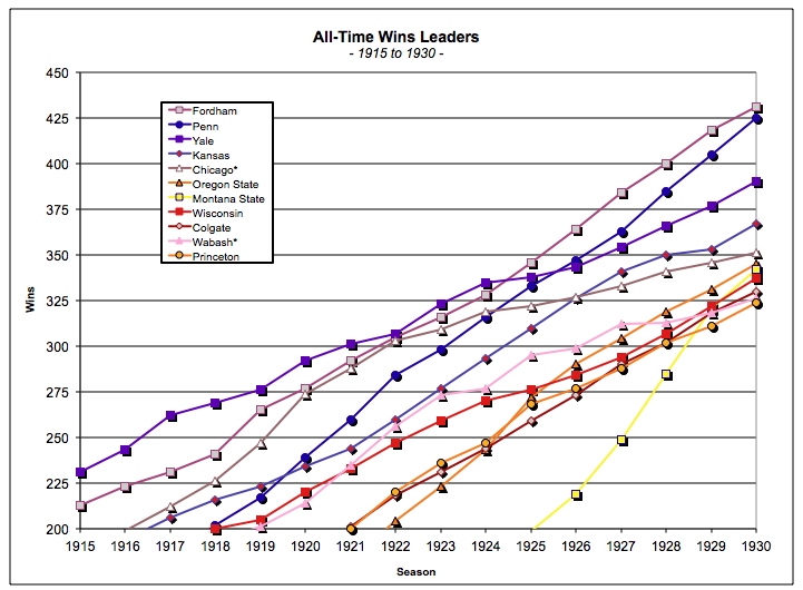 Most schools did not start playing basketball until after 1900, however some Eastern schools began playing before that. Temple was the first school to reach the 100 victory milestone although Yale soon took a commanding lead. Temple continues its swoon and falls off the chart while Yale, Fordham and Chicago vie for the lead.