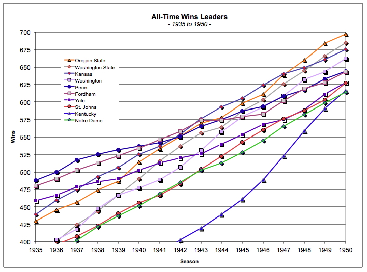 Penn and Fordham continue to battle while Kansas sneaks into contention. Penn is the first to reach the 500 victory mark.