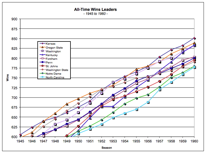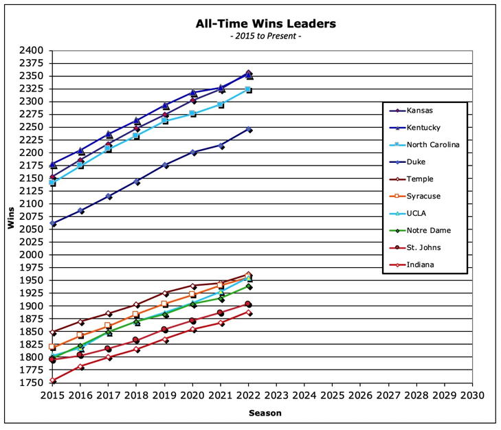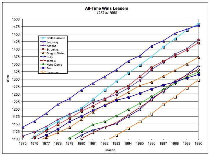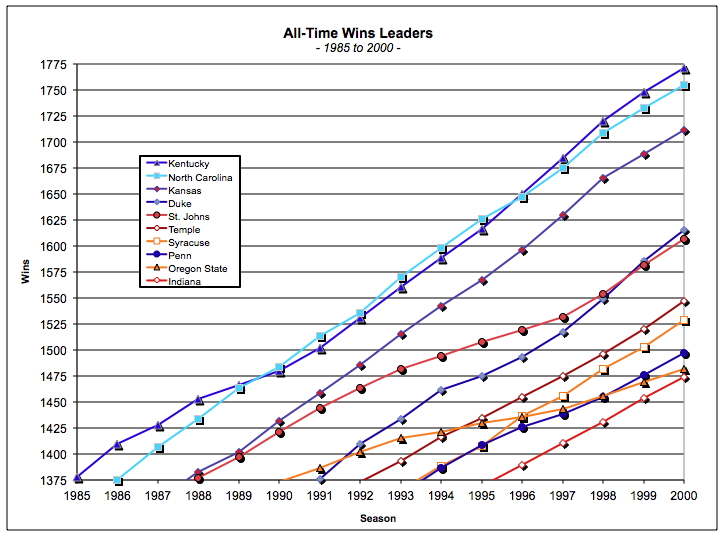 Kentucky and North Carolina continue to battle while Kansas stays close behind. North Carolina takes the lead and is the first school to reach 1500 victories, before Kentucky reassumes the crown.