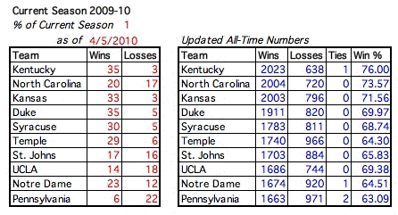 One important milestone is the race to be the first program to win 2000 victories. In recent years it looked like Kentucky had built a considerable lead and would be the first program to hit the mark. However given recent struggles, which prompted and included a coaching change from Tubby Smith to Billy Gillispie and now to John Calipari, Kentucky has faltered relative to their rivals and their historic averages.