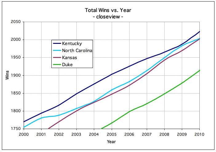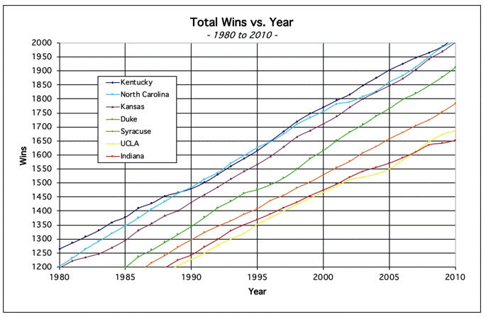 While it's hard to believe that the race for 2000 wins will get any more intense (or stranger) than the race for 1000 wins (won by Kentucky over Kansas by a hair), it's certainly possible. If the trends hold out (see graphs below), all three programs will be in position to hit the mark as early as the first half of the 2009-10 season. Kentucky has already made plans to commemorate the occasion.
