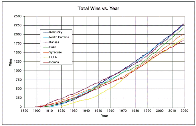 As reference, below is a wider time frame showing the top programs going back to 1900, around the time most programs began playing basketball. The graph illustrates just how close these schools really are.