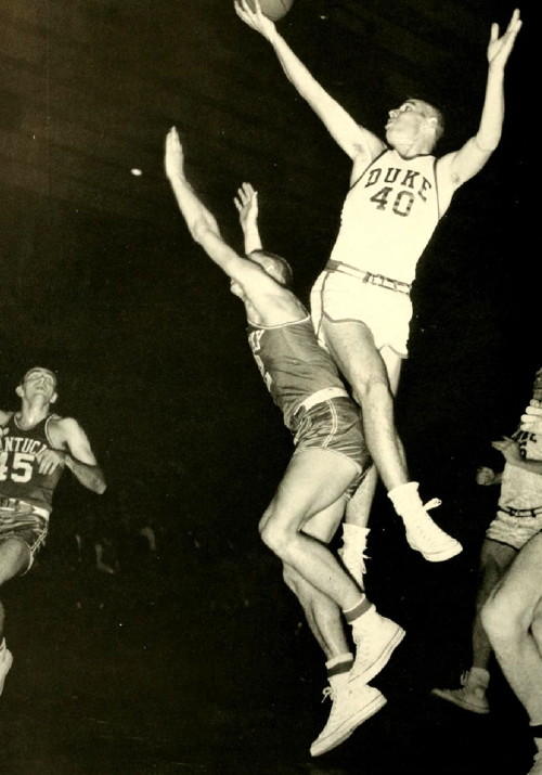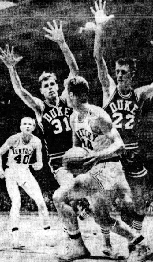 Kentucky flirted with blowing the game open in the second half but each time the Blue Devils staged a comeback to cut the lead. Said the Lexington Herald, "Five times in the last half Coach Adolph Rupp's Wildcats appeared well on their way to a decisive victory over the Atlantic Coast Conference team, but each time Duke came battling back and at the finish had the Wildcats hanging on the ropes and the spectators hanging limply to their seats. And the officials came dangerously close a hanging too."