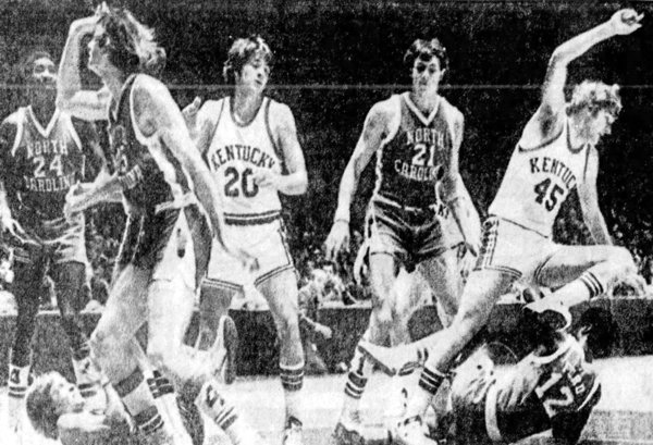 Kentucky returned the favor the next year by playing UNC in Greensboro. The Wildcats used a balanced attack to overcome 25 points from Doug Moe and 22 points from York Larese, winning 70-65.