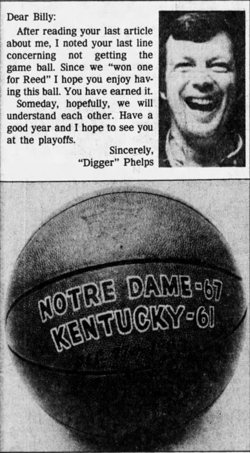After the contest was over, Phelps apparently had more than one score to settle as he went over to press row and berated sports columnist Billy Reed who had earlier questioned Phelps' coaching ability. Shaking his finger at the scribe, Phelps yelled "This one was for you -- for YOU! Don't ever say again that I can't coach." Later in one of his columns, Reed had the temerity to suggest that if he had won the game for the Irish, he at least deserved the game ball. Sure enough, soon after the article was published a package arrived from South Bend with a worn-out basketball with the inscription Notre Dame 67, UK 61 on it.