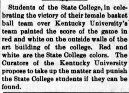 There was bad blood from the very beginning between the colleges, which at the time considered themselves sister schools. [Even the women got into the action. After the initial women's game in 1902 students of State College painted the score of the game on the outside walls of the KU art building. At the time State's school colors were Red and White. The KU curators vowed to seek to "punish the State College students if they can be found." (Article from Maysville KY Evening Bulletin, February 24, 1903). A game in 1904 was cancelled when the ladies from K.U. and State College couldn't agree whether it was proper to wear bloomers in the presence of male officials. In 1910 the two teams couldn't agree on the gymnasium to use. When no agreement could be reached, each team declared their opponent to be in forfeit.] According to the Lexington Leader the score of the first game was 10-2 and nearing halftime when a "squabble delayed the game for quite a time."