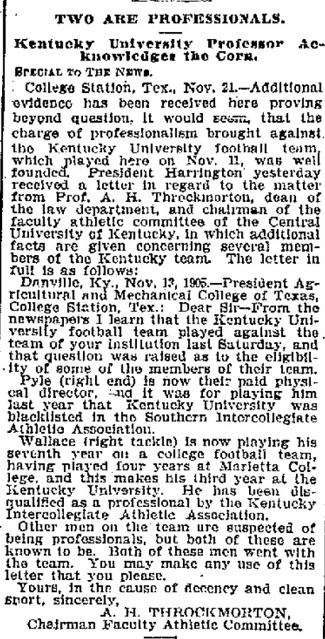 The 1905 football season saw much the same acrimony over the Thanksgiving football game. The two teams squabbled over the location of the game and questioned eligibility of players. And once again the K.I.A.A. waded into the issues, with A.H. Throckmorton, who was a notable and persistent critic of K.U., leading the charge. Throckmorton was known to contact K.U.'s opponents (including as far away as Texas A&M) to reveal his charges against the school. He also accused the K.U. faculty with breach of ethics for allowing the use of 'ringers' and players with questionable eligibility.