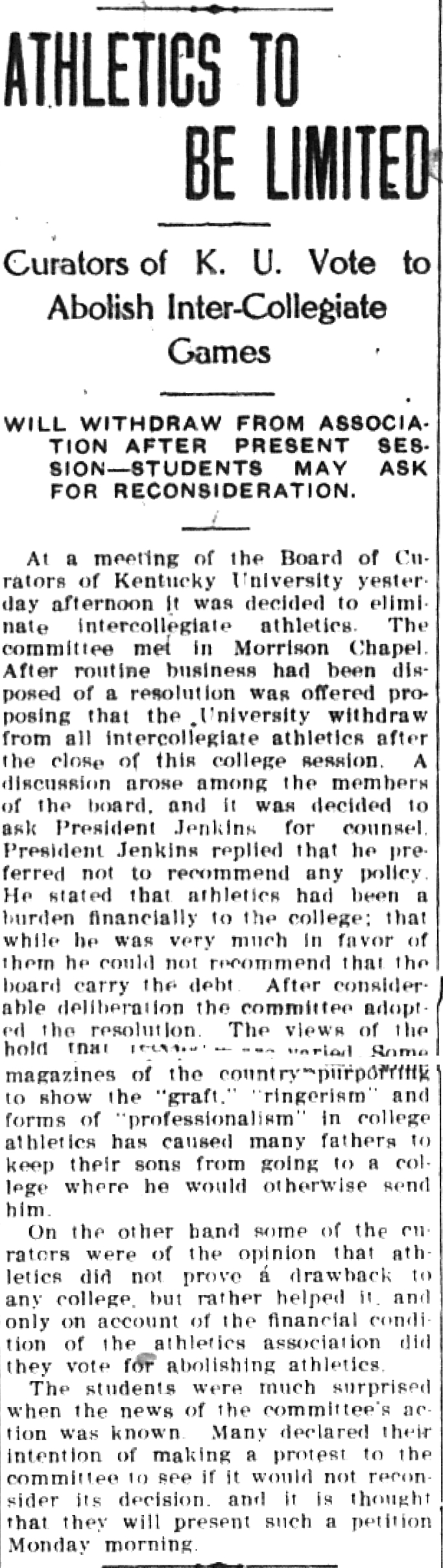 In early March of 1906 Kentucky University's Board of Curators, citing heavy financial burdens of maintaining the football program, voted to withdraw from intercollegiate athletics altogether. (At the time K.U. had poor football facilities and played most of their games away from home, including typically the games against State College.) The vote was unanimous although it was a difficult decision and it was said that "they did not altogether desire to do so."