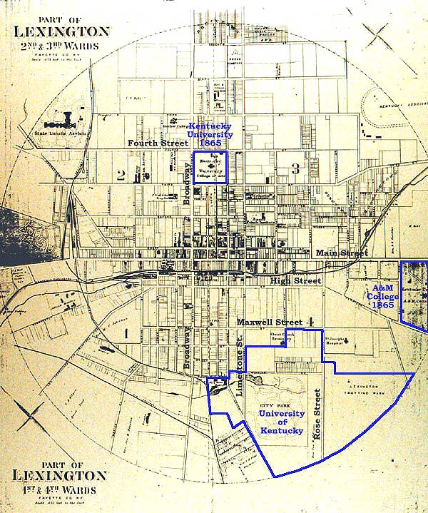 The institutions share a common origin, in that at one time they were both part of the same school. Transylvania was the first public school established in Kentucky in 1780. By 1865, however, the school was in financial distress and agreed to merge with a denominational school (Bacon College at the time based in Harrodsburg) to form Kentucky University. Near the same time, the 1862 Morrill Act allowed for establishment of an agriculture and mechanical arts (A&M) school. By the time Kentucky University was formed, a college for A&M was also included in the plan, and was placed in what is today Woodland Park. This arrangement did not last, however, and A&M was spun off in 1878 as an independent state-run school. Four years later A&M took advantage of their land-grant status and moved to the South side of Lexington, taking over the City Park and fairground area, to eventually become what is today known as the University of Kentucky. (see map)