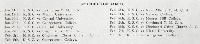 The two schools met twice during the 1904 basketball season. For K.U., Howard Guyn not only played but served as the manager of the team. Hogan Yancey was named the captain (but did not play due to the newly accepted K.I.A.A. provision). State College's first basketball manager was Leander Andrus. Claire St. John was K.S.C.'s captain. There were no coaches at the time at either school for the sport.