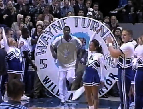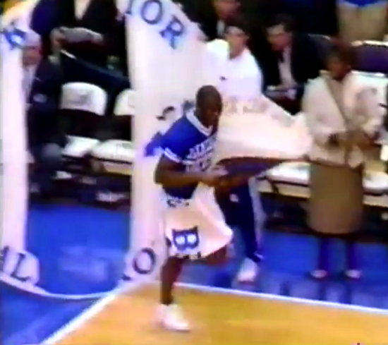 Later on, apparently starting in 1977 the University began to employ a large hoop covered in paper for the players to run through during introductions. The very first seniors to run through the hoop were the duo of Larry Johnson and Merion Haskins.