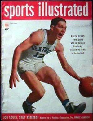 Note: The inaugural Sports Illustrated with Ralph Beard on the cover is not recognized by Sports Illustrated today. The reason is that the original Sports Illustrated magazine was published by Dell beginning in 1949 (with Beard on the cover) in a very crowded market for sports publications. This oversized magazine was published only briefly before publication ceased (and the issues that were published subsequently became collector's items.)