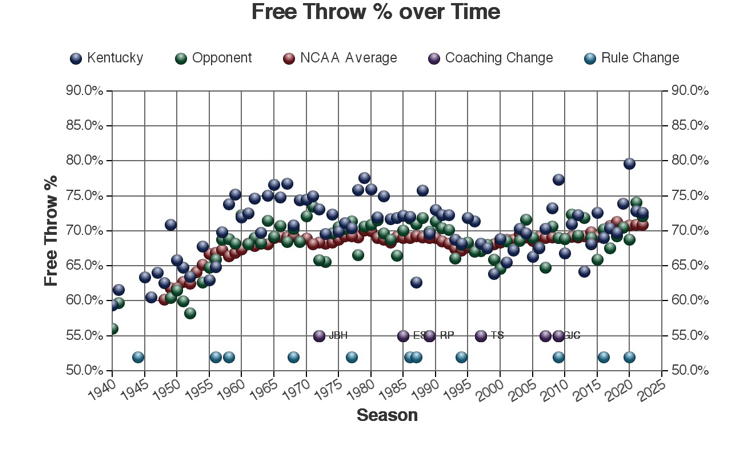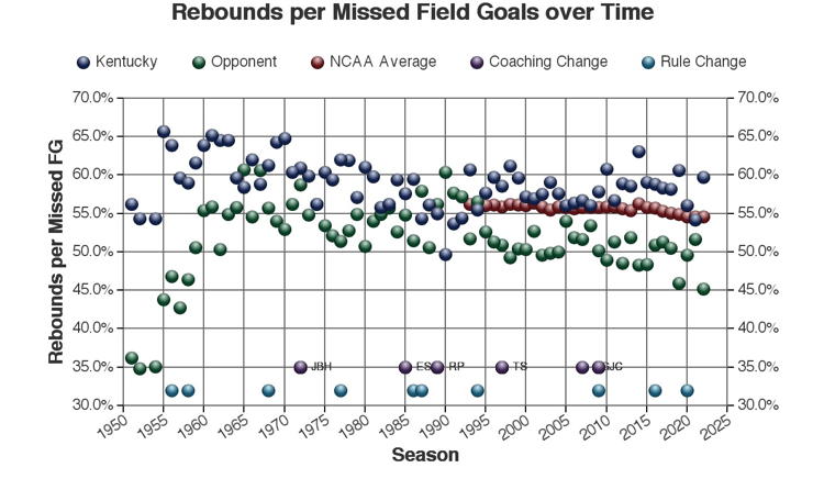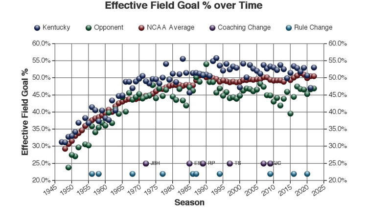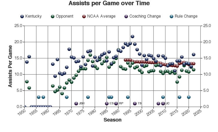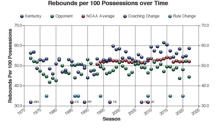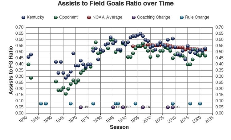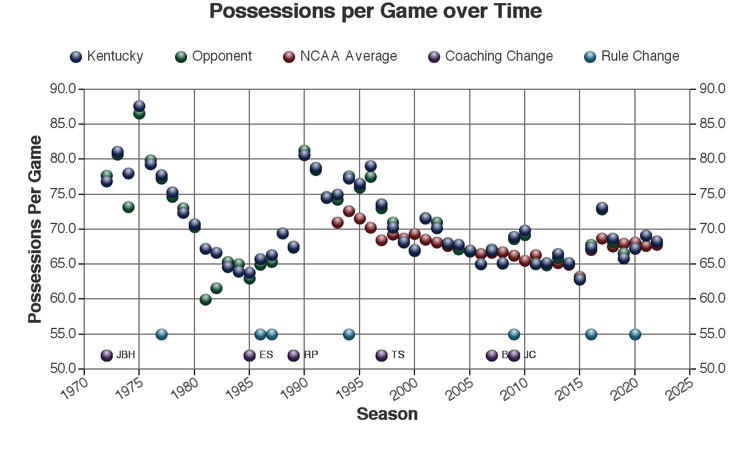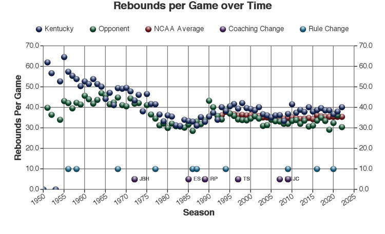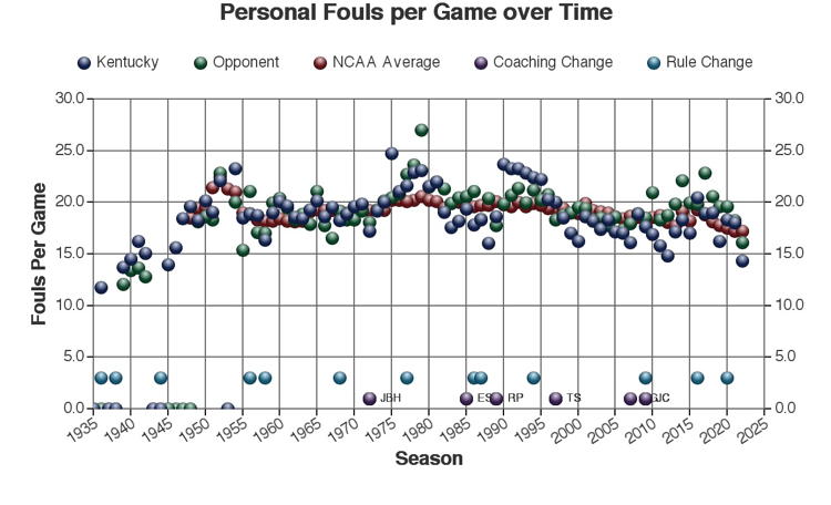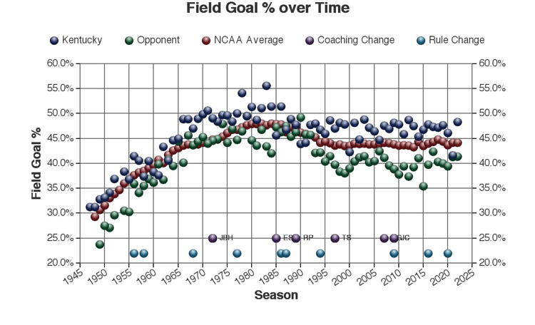 There are at least three types of factors to consider when viewing these trends: 1.) The coach of Kentucky at the time 2.) rules changes which may or may not have affected the game and 3.) other changes in college basketball which may have affected the game. Coaching changes and major rules changes are marked on many of the plots as a guide.