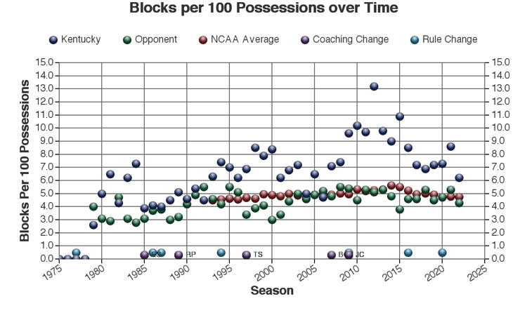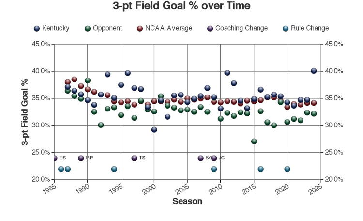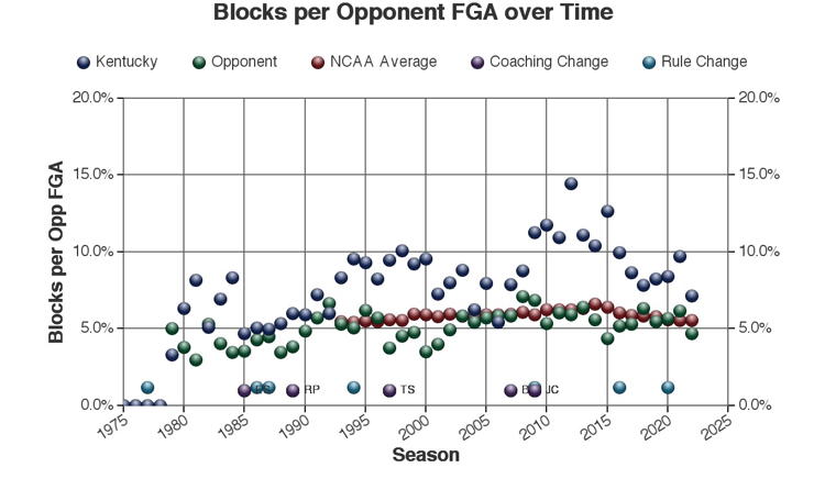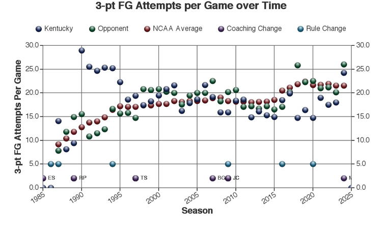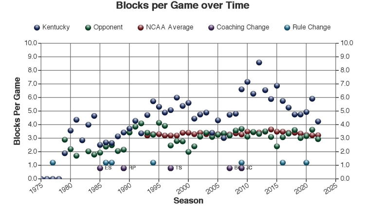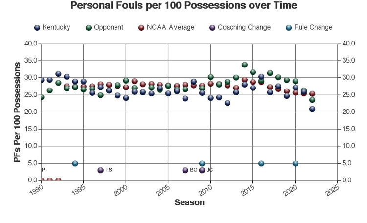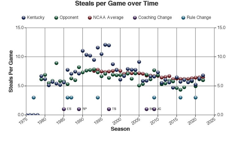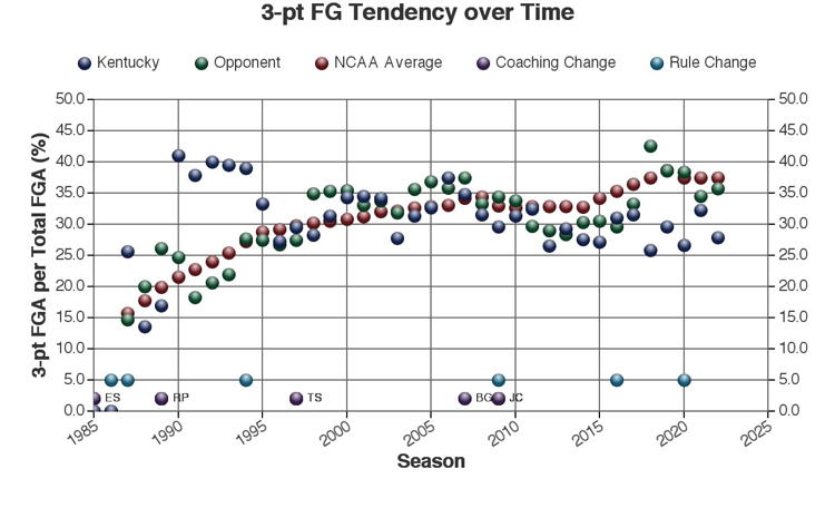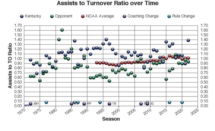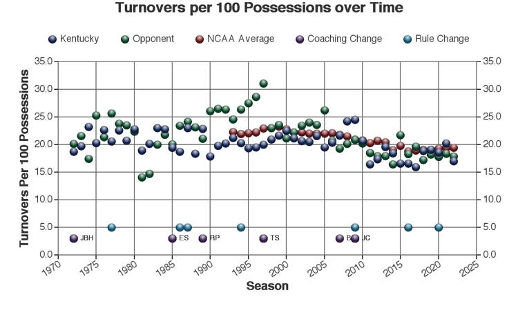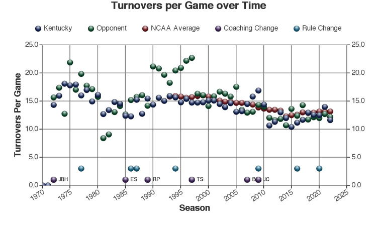 There are at least three types of factors to consider when viewing these trends: 1.) The coach of Kentucky at the time 2.) rules changes which may or may not have affected the game and 3.) other changes in college basketball which may have affected the game. Coaching changes and major rules changes are marked on many of the plots as a guide.