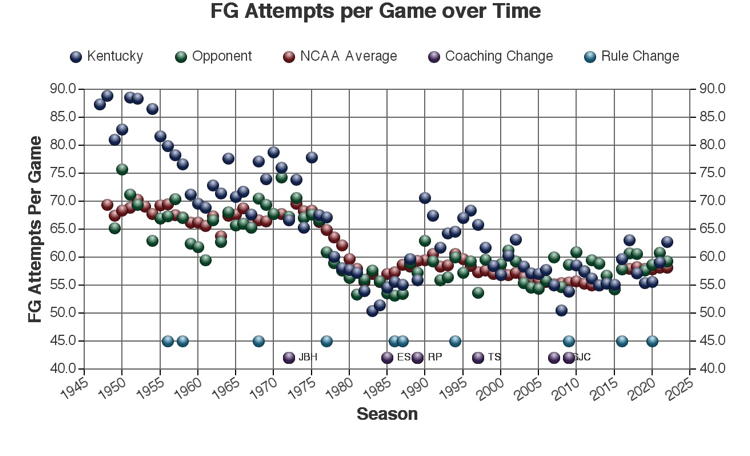 It is instructive when viewing this information to consider the coach at that time and their coaching philosophy and points of emphasis. You may want to refer to the below table to determine which years each coach was at UK. A more complete list is at the following link.
