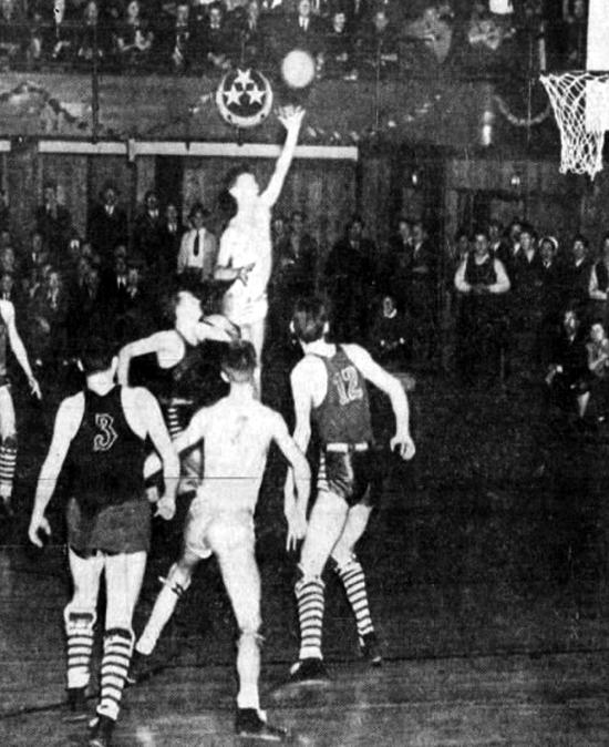 Tennessee's Gilbert Huffman soars for a left-handed shot which ties the score at 32-32 and sends the game into overtime. Also shown are Tennessee's Frank Thomas (#7), Bernard Opper (#3) and Marion Cluggish (#12)