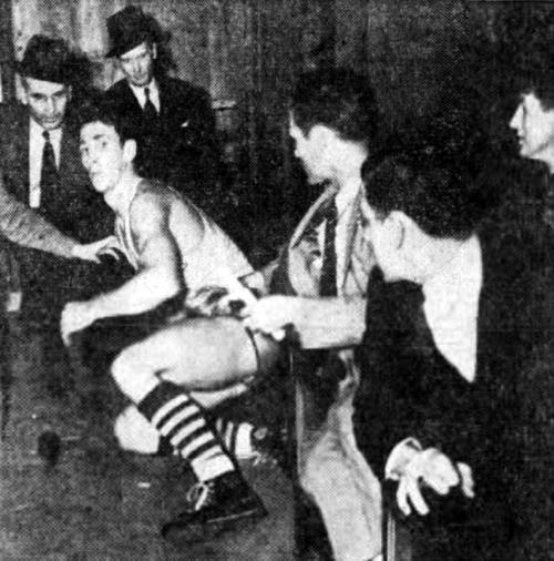 Homer (Tub) Thompson lands in the seats after taking a hard fall.