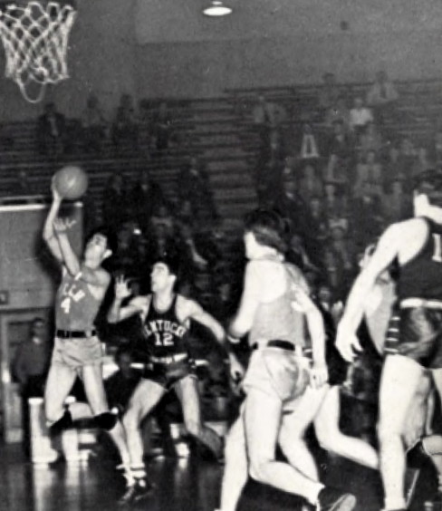 Carlton Lewis (#4) scores a layup in front of Vincent Splane (#12)