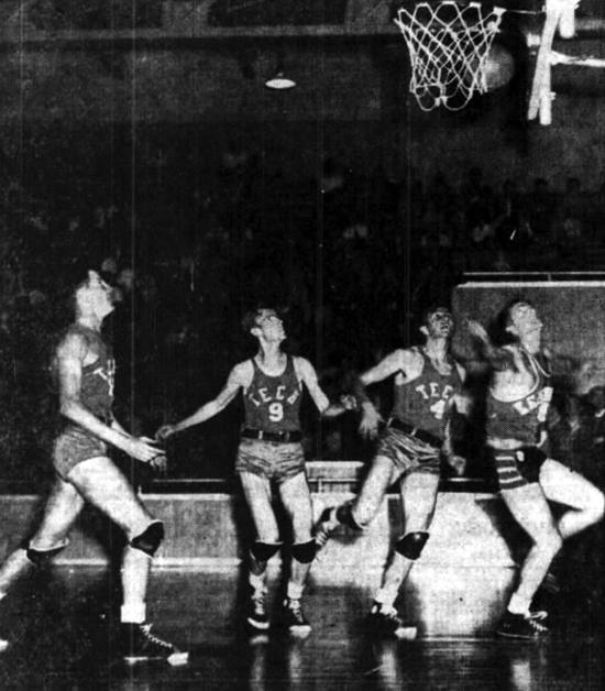 Marvin Akers (#8) misses a shot under the goal for Kentucky. Waiting for the rebound are three Yellow Jackets. From left to right: Jack Lance, William "Boneyard" Johnson (#9) and Carlton Lewis (#4)