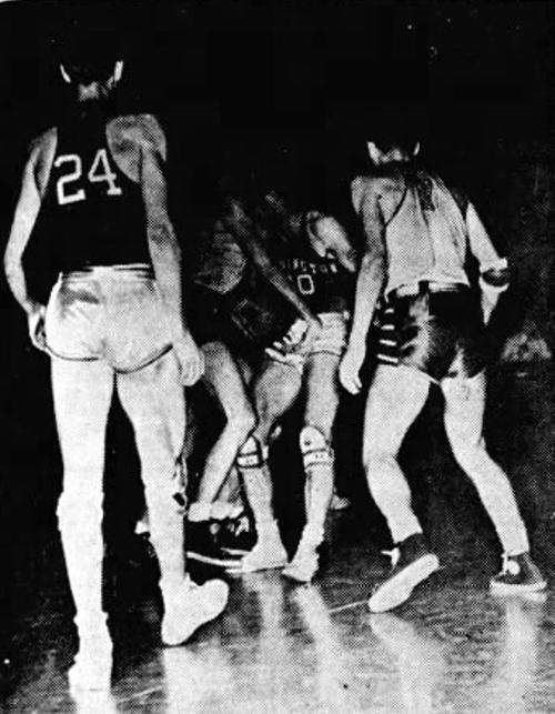 Melvin Brewer and Washington U's Mike Todvovich (#30) get tied up and a jump ball is called. Looking on are Washington's Jack Darnton (#24) and Milt Ticco (#7)
