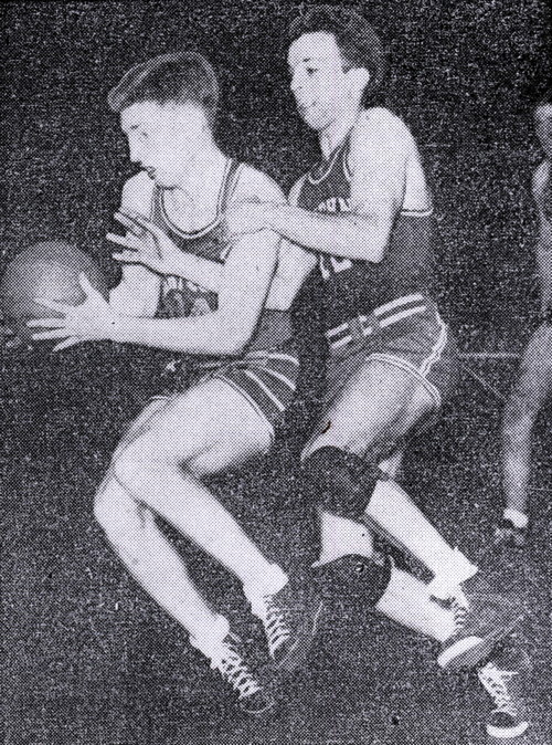 Bob Brannum (#18) leaps to defend against St. Johns' Bill Kotsores (#3)