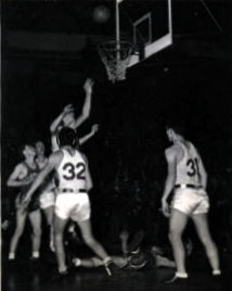 A UK player shoots while Lou Goldstein (32), Lester Rothman (31) and Joe Becker (24) look on