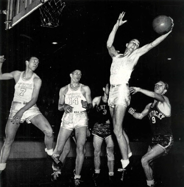 Georgia Tech's Dick Collier (#10) grabs the ball in front of Johnny Stough (#9) and Jack Parkinson (#3)