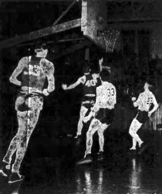 Kentucky's Ralph Beard (#40) scores the opening points in the Paducah Tilghman gymnasium. Watching Beard score are Vanderbilt's Joe Kraft (#33 in white) and Hank Duvier (#22). Kentucky's Jack Tingle (#33 in blue) watches from the baseline.