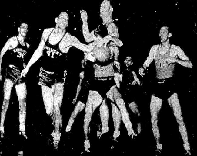 Wallace Jones tries to take the ball away from Florida's Jeff Henderson (#6). Florida's Robert Ryan is behind Henderson while Jack Hagar (#10) is to the right and UK's Wilbur Schu (#36) is to the left
