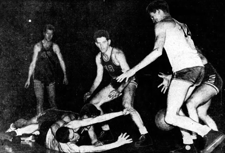 While on ground with Temple's Jerry Rullo, Beard tries to throw ball to Joe Holland (#14). Also seen are Temple's Bill Bechtloff (#43) and Jack McLaughlin (#18)