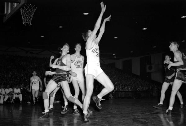 Kentucky guard "Jimmy" Jordan (#30) shoots backwards toward the goal in what was called the "shot of the night". Watching the flight of the ball (not shown) is Michigan State's Bob Geahan (#18) and Kentucky's Bob Brannum (#20)