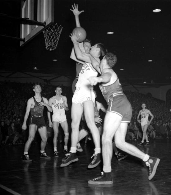 Alex Groza (#15) is fouled on the way to the basket by two Georgia players. Looking on from the far side of the basket is Jack Tingle (#19) and Georgia's Morgan Harvill (#15)