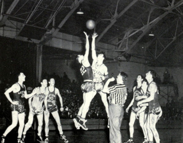 Wallace Jones (#27) tips off against Notre Dame's John Hiller (#18) while UK's Alex Groza (#36) and Kenneth Rollins (#26) look on