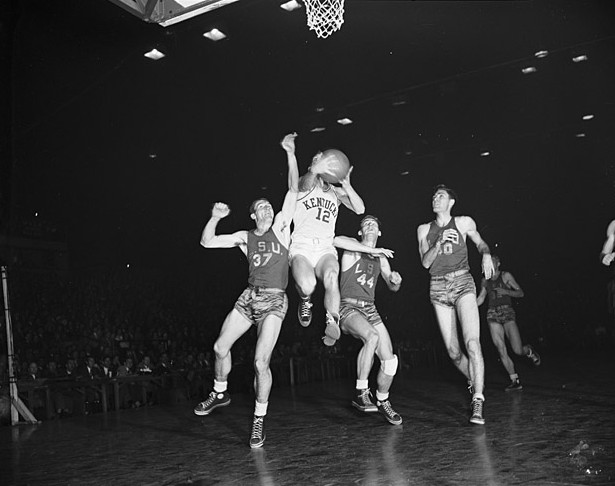 Wallace Jones (#27) waits for a rebound while Ralph Beard (#12) looks on