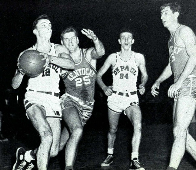 Wallace Jones (#27) battles an unidentified DePaul player while Alex Groza looks on