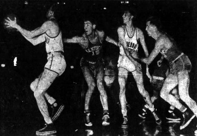 Vanderbilt's George Kelley drives past Walter Hirsch while Alex Groza (#15) comes to help