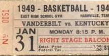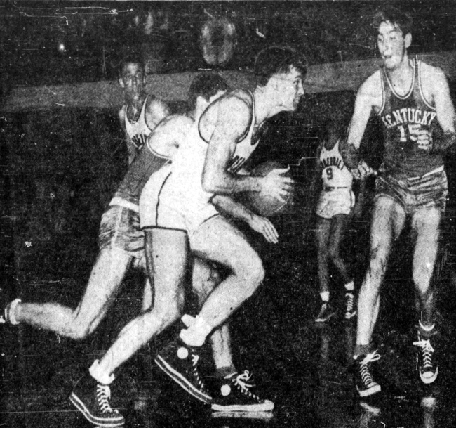 Alex Groza fouls Vanderbilt's Mike Craig as he drives toward the basket. Also shown are Vanderbilt's Pete Robinson (#12) and Cliff Barker