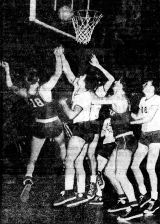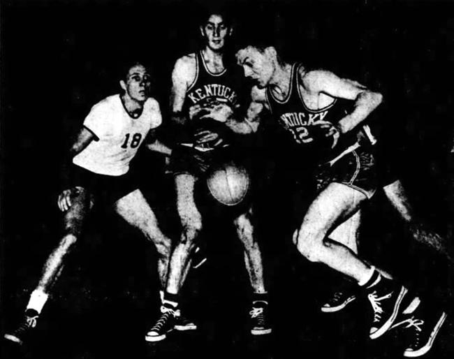 Alex Groza shields Mississippi's Maxie McMullen (#18) to allow Ralph Beard (#12) a lane to dribble