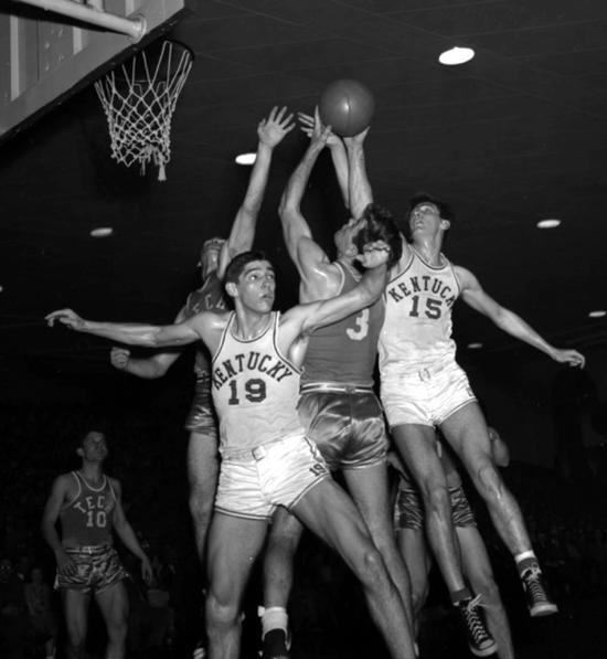 Ralph Beard shoots while Alex Groza (#15) and Wallace Jones (#27) look on