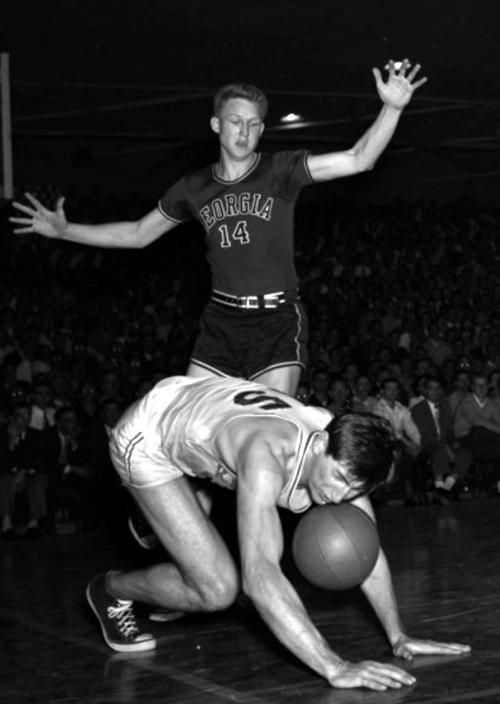 Alex Groza stumbles against the Georgia defender, yet still manages to set an SEC record with 38 points.