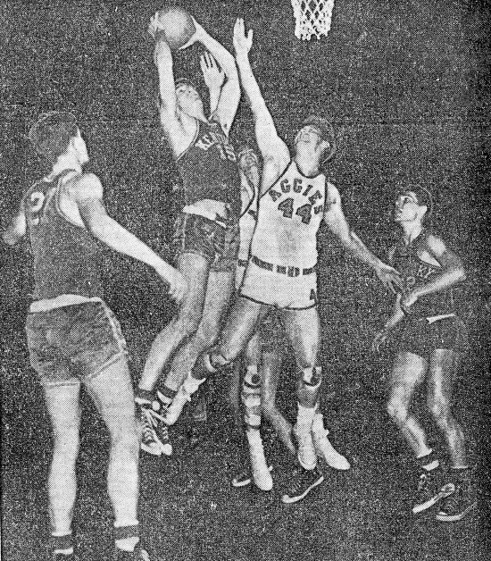 Alex Groza shoots in front of A&M's J.L. Pards (#44) while Wallace Jones and Ralph Beard look on