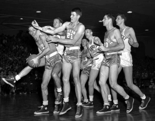 Line-up to see who has the ball. Tennessee's Ed Montgomery holds the ball followed by UK's Jim Line (#25), UT's Dale Powell (#21) and Don Graham (#13), UK's Shelby Linville (#11), UT's Art Burris (#20) and UK's Bill Spivey (#77)
