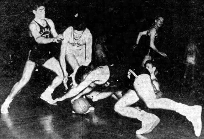 Alabama's Dick McKenzie (#33) dives for a loose ball while Bill Spivey reaches down Looking on is Alabama's Nick Vrotos (#77)