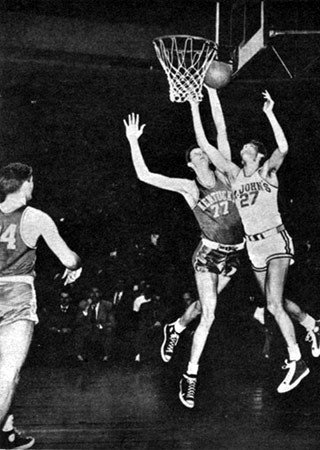 Frank Ramsey is fouled while shooting by St. Johns' Al McGuire (#18)