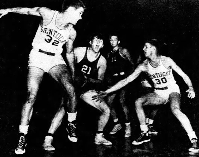 Louisville's Dick Robison (#21) is hounded by Kentucky's Skippy Whitaker (#32) and Frank Ramsey (#30) while U of L's Bob Naber (#11) looks on