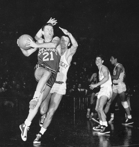 Bob Zawoluk (#30) tries to score inside, as UK's Cliff Hagan (#6) defends from the front