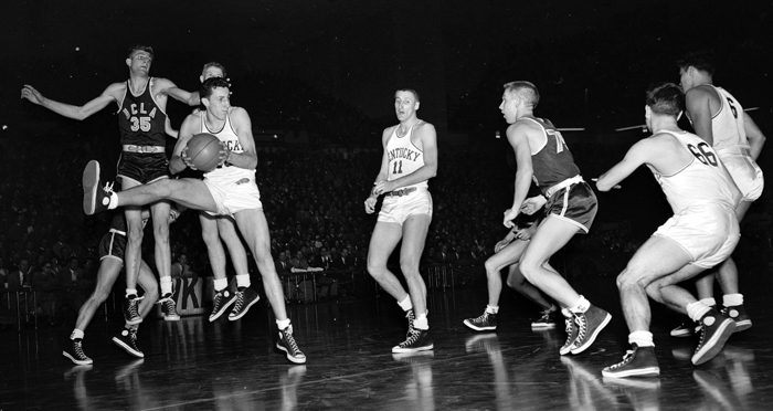Lou Tsioropoulos grabs a rebound while Shelby Linville (#11) looks on. Others shown are Cliff Hagan (#6) and Bobby Watson (#66) and UCLA's Mike Hibler (#35) and Ronnie Livingston (#75)